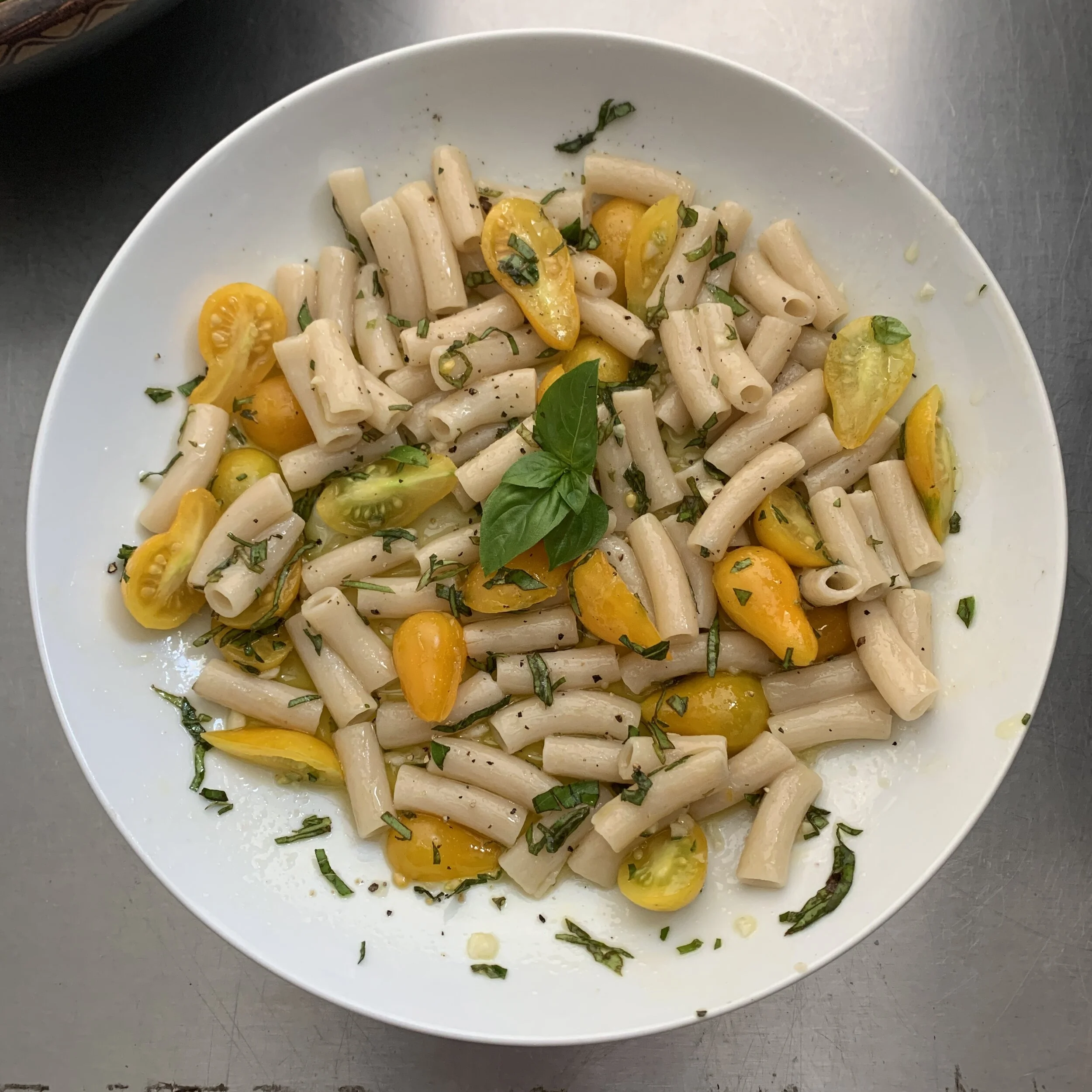 It’s summer and we are sheltering at home in Los Angeles. One bright side of this quarantine is that people have found a renewed interest in home hobbies like gardening. I benefited from visiting a friend’s garden mid-town and going home with a heavy bag full of fruits and vegetables. Tomatoes are in season and these golden grape tomatoes are exquisite. Like candy!
